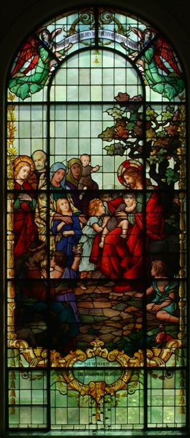 Jesus blessing the children is one of the most endearing images in Christian art. The window at St. John’s depicts a conventional design. Jesus, seated on a garden bench, holds a lively, curly-haired toddler in his lap, as he stretches out his hand to a youth who eagerly approaches him. Around them, mothers and children patiently wait for a blessing; one small boy (bottom left) proffers a bouquet of flowers, while another (bottom left) grasps a palm branch. An older man stands behind the woman with the blue veil and is perhaps her husband and father of the boy she holds. These three figures are reminiscent of the holy family: an older man, a young mother and a son. At the far left St. John the Evangelist stands in for the disciples who accompanied Jesus during this event and rebuked the crowd for wasting the Lord’s time upon little children. Lack of space and/ or a desire to single out the Chapel’s patron saint might explain the omission of other apostles. Jesus receives the families in a garden beneath a tree whose leaves of varying hues subtly herald the turning of the season. At the top of the window is the quote, “Suffer the little children to come unto me and forbid them not.” At the bottom is “For such is the kingdom of heaven.” (Matt. 19:13-15)
